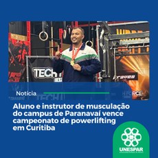 O estudante do curso de Educação Física e instrutor de musculação do campus de Paranavaí da Universidade Estadual do Paraná (Unespar), Heron Vinicius Romeiro Silva, sagrou-se campeão do Powershow, competição de nível nacional de powerlifting da World Raw Powerlifting Federation (WRPF), realizado no último dia 7, em Curitiba.