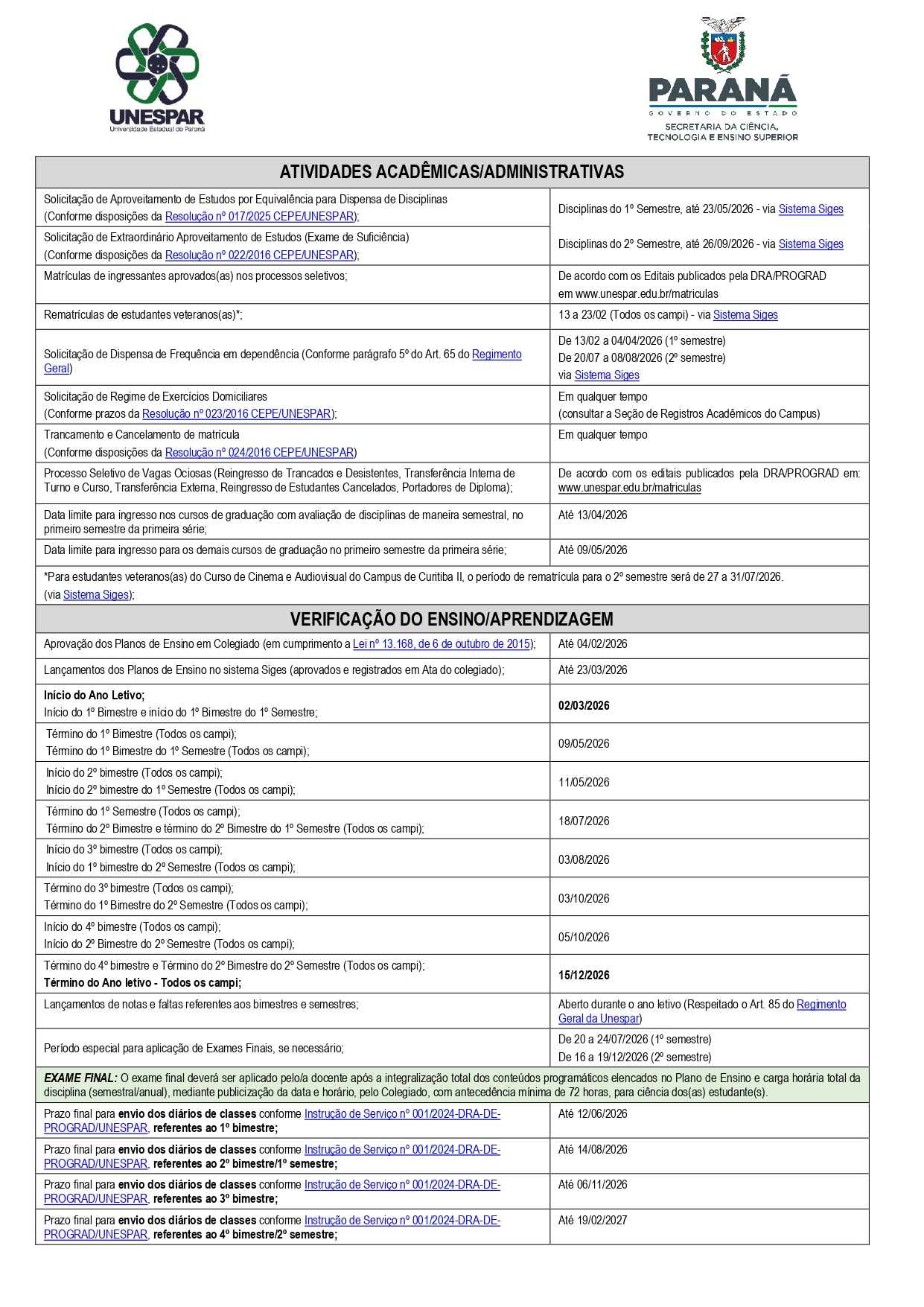 Calendário Acadêmico 2026