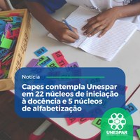 A Universidade Estadual do Paraná (Unespar) foi contemplada em 22 Núcleos de Iniciação à Docência e cinco Núcleos de Alfabetização pelo edital da Coordenação de Aperfeiçoamento de Pessoal de Nível Superior (Capes). Com isso, serão ofertadas 648 bolsas de iniciação à docência para estudantes dos cursos de licenciatura que participaram do processo seletivo do Programa Nacional de Bolsa de Iniciação à Docência (Pibid).