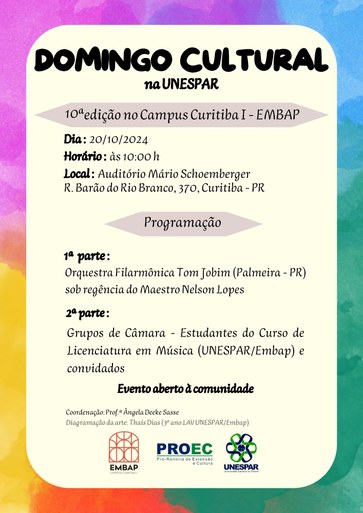 A Universidade Estadual do Paraná Campus Curitiba I – Escola de Música e Belas Artes do Paraná convida a comunidade acadêmica e o público em geral para prestigiar a 10ª edição do Domingo Cultural na UNESPAR, um evento que promete uma experiência enriquecedora que ocorrerá na Sede da Barão, no domingo, dia 20 de outubro de 2024, às 10h.