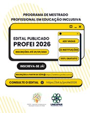 O Mestrado em Educação Inclusiva (Profei), está com inscrições abertas, até 29 de setembro, às 16h59, para a turma de 2026. Podem participar do processo seletivo, professores com diploma de graduação, que atuam na redes públicas de ensino. A taxa é de R$ 130.