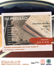 A exposição im-pressão apresenta trabalhos de nove artistas do curso de Bacharelado em Artes Visuais da EMBAP que, ao longo do primeiro semestre de 2025, investigaram a gravura por meio de procedimentos que dialogam tanto com a tradição quanto com a experimentação contemporânea. Os trabalhos são resultado da disciplina Estudos Avançados em Artes Visuais 5, orientada pelo professor André Rigatti.