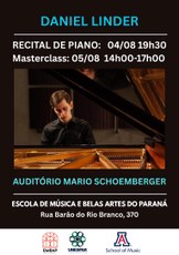 A Escola de Música e Belas Artes do Paraná (EMBAP) tem a honra de receber o renomado pianista Daniel Linder, professor da Universidade do Arizona (EUA), para dois eventos imperdíveis em Curitiba.
