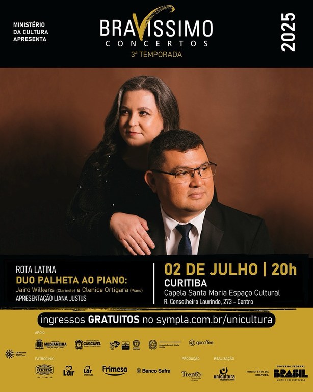 O Bravíssimo Concertos apresenta: ROTA LATINA – Duo Palheta ao Piano, com Jairo Wilkens (clarinete) e Clenice Ortigara (piano)