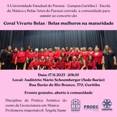 A Universidade Estadual do Paraná – Campus Curitiba I convida a comunidade para prestigiar o concerto do Coral Vivarte Belas, um grupo vocal formado por mulheres 50+ que valorizam sua bagagem cultural e promovem inclusão, representatividade e potência artística.
