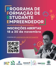 📭 A Diretoria de Assuntos Estudantis, por meio da Pró-reitoria de Políticas Estudantis e Direitos Humanos, está com inscrições abertas para o Programa de Formação de Estudante Empreendedor - PFEE. Podem se inscrever estudantes com matrícula regular nos cursos de graduação da Unespar em situação de vulnerabilidade socioeconômica.