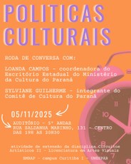Roda de conversa sobre políticas culturais com Loana Campos, coordenadora do Escritório Estadual do Ministério da Cultura do Paraná, e Sylviane Guilherme, integrante do Comitê de Cultura do Paraná. Data: 05/11/25, quarta-feira das 19 às 20:30h. Local: Auditório da sede Tiradentes, rua Saldanha Marinho 131, 5o andar. Atividade de extensão aberta ao pública da disciplina Circuitos Artísticos 2, curso Licenciatura em Artes Visuais da EMBAP, campus Curitiba I - UNESPAR.