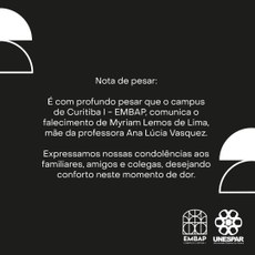 É com profundo pesar que o campus de Curitiba I - EMBAP, comunica o falecimento de Myriam Lemos de Lima, mãe da professora Ana Lúcia Vasquez.
