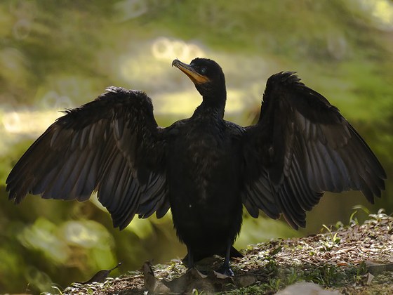 Ele mede entre 58 e 73 cm, tem envergadura de até 1 metro e corpo preto. Os adultos têm olhos azuis, pele amarela no rosto e algumas penas brancas no pescoço na época de reprodução. Fora dessa fase, ficam com cores mais opacas. Os filhotes são mais claros e acinzentados.