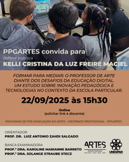 O Programa de Pós-Graduação em Artes – Mestrado Profissional (PPGARTES) convida para Banca de Defesa Pública da discente Kelli Cristina da Luz Freire Maciel.