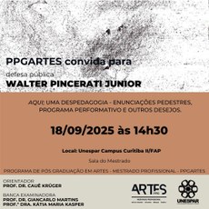 O Programa de Pós-Graduação em Artes – Mestrado Profissional (PPGARTES) convida para Banca de Defesa Pública do discente Walter Pincerati Junior