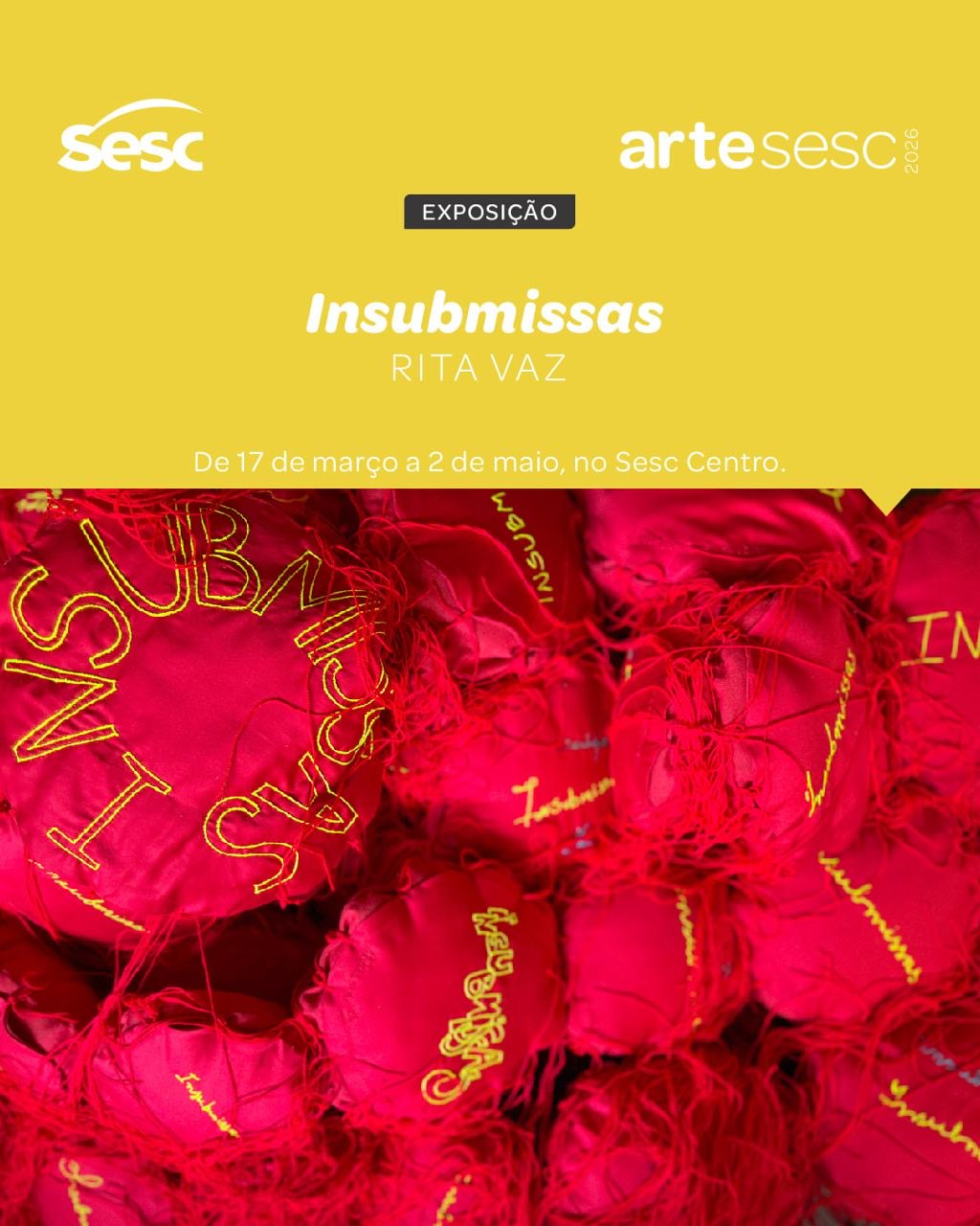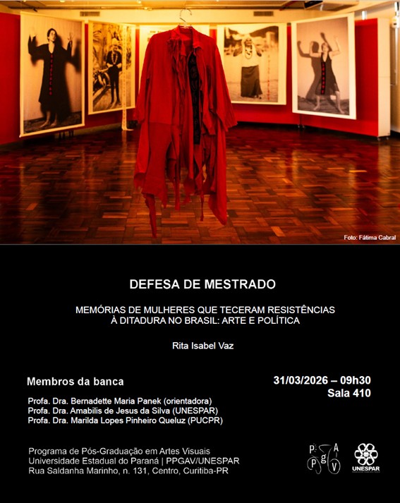 O Programa de Pós-Graduação em Artes Visuais da Universidade Estadual do Paraná (PPGAV/UNESPAR) convida para a exposição individual da aluna do PPGAV, Rita Isabel Vaz, construída em diálogo com a sua pesquisa de mestrado. A exposição "Insubmissas" acontecerá de 17 de março a 02 de maio, na Galeria do Sesc Centro. A abertura será no dia 17 de março de 2026, às 19 horas. Sesc Centro: R. José Loureiro, 578, Centro, Curitiba - Paraná.