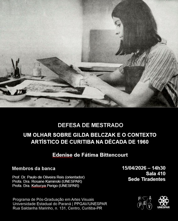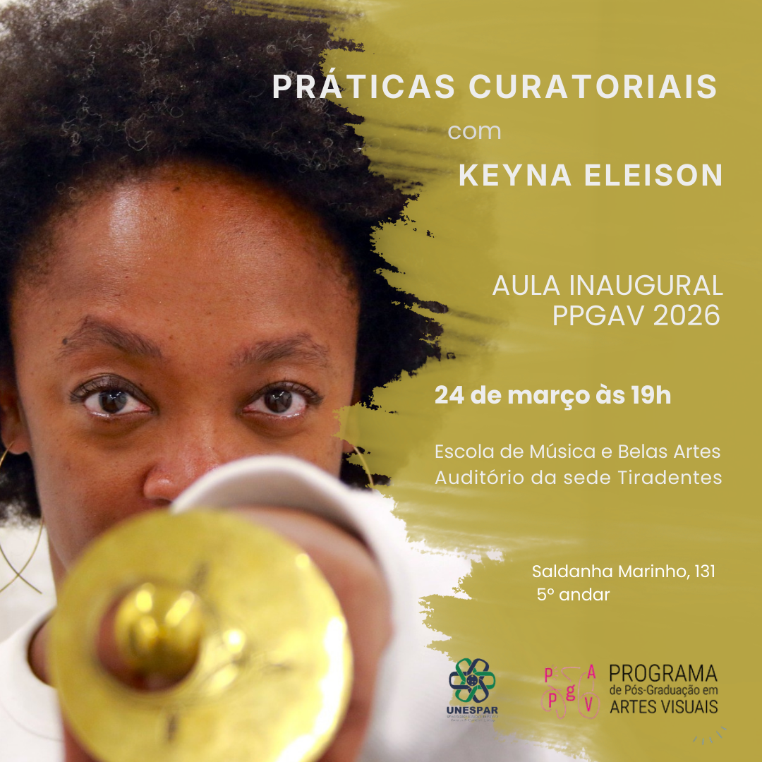 O Programa de Pós-Graduação em Artes Visuais da Universidade Estadual do Paraná (PPGAV/UNESPAR) convida para a Aula Inaugural "Práticas Curatoriais", com a curadora Keyna Eleison, dia 24 de março, 19h, no Auditório da Sede Tiradentes do Campus Curitiba I da Unespar, Rua Saldanha Marinho, 131, 5º andar, Centro, Curitiba-PR.