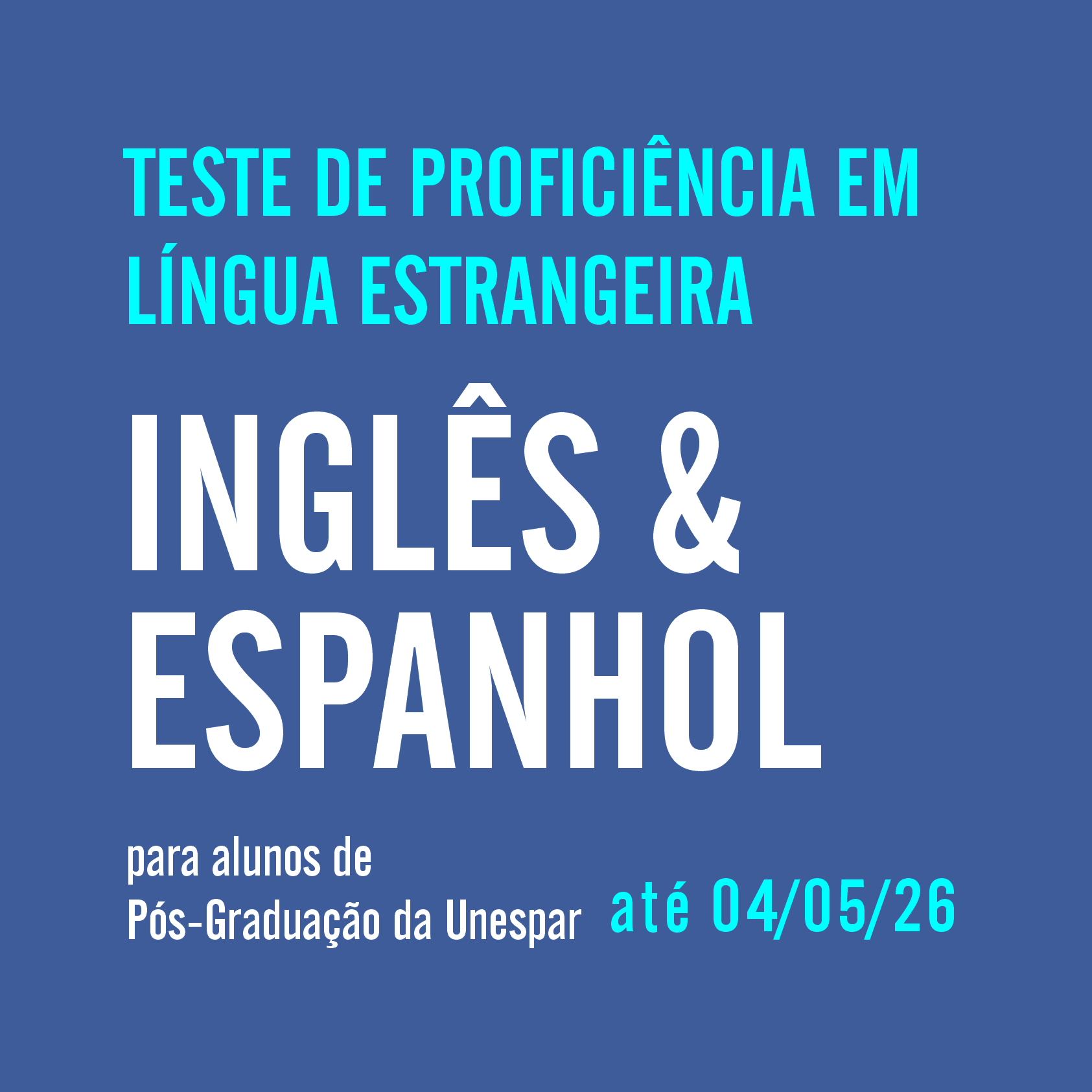 Estão abertas as inscrições até 04/05/26 para o Teste de Proficiência em Língua Estrangeira (inglês e espanhol) para alunos regulares dos Programas de Pós-Graduação da Unespar. Mais informações NESTE LINK