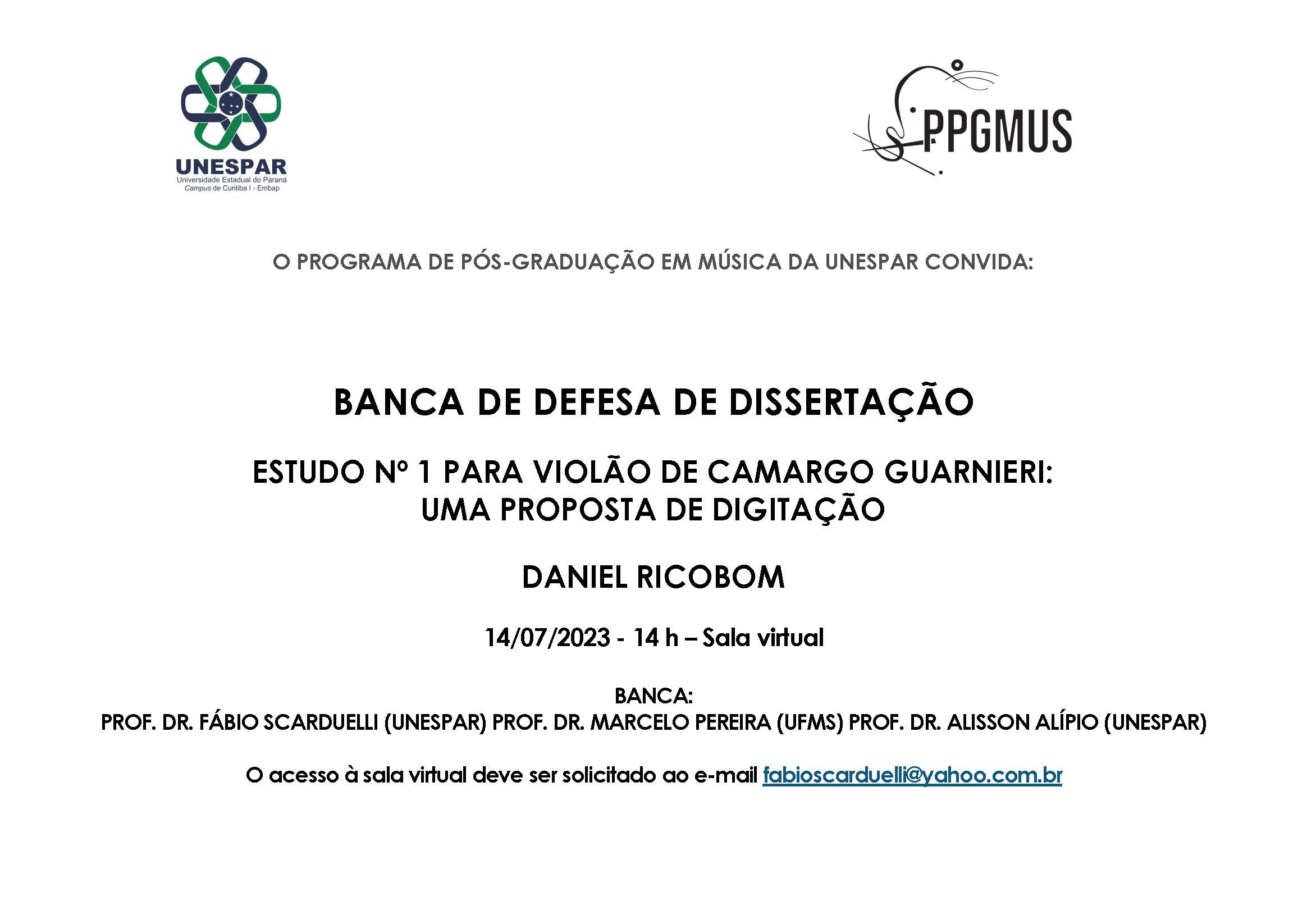 O PPGMUS convida a todos para a banca de defesa de dissertação do mestrando Daniel Ricobom. Seu trabalho se intitula "Estudo n.o 1 para violão de Camargo Guarnieri: uma proposta de digitação" e foi orientado pelo prof. Fábio Scarduelli.