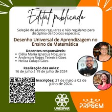 Estão abertas as inscrições para alunos regulares e não regulares na disciplina de Tópicos Especiais: Desenho Universal de Aprendizagem no ensino de matemática. A presente disciplina será ministrada pelos seguintes docentes: Prof. Dr. Anderson Roges Teixeira Góes, pós-doutorando do PRPGEM; Profa. Dra. Heliza Colaço Góes, pós-doutoranda, e a Profa. Dra. Clélia Maria Ignatius Nogueira, docente do PRPGEM.