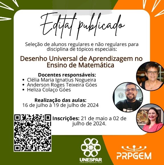 Estão abertas as inscrições na disciplina de Tópicos Especiais: Desenho Universal de Aprendizagem no ensino de matemática